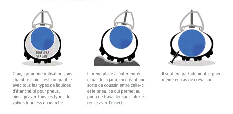 Conçu pour une utilisation tubeless, il est compatible avec tous les types de liquides d'étanchéité pour pneus. Compatible avec tous les types de valves tubeless du marché. Prend place à l'intérieur du canal de la jante en créant une sorte de coussin entre celle-ci et le pneu, permettant au pneu de travailler sans aucune interférence de l'insert. Il soutient parfaitement le pneu même en cas de crevaison.